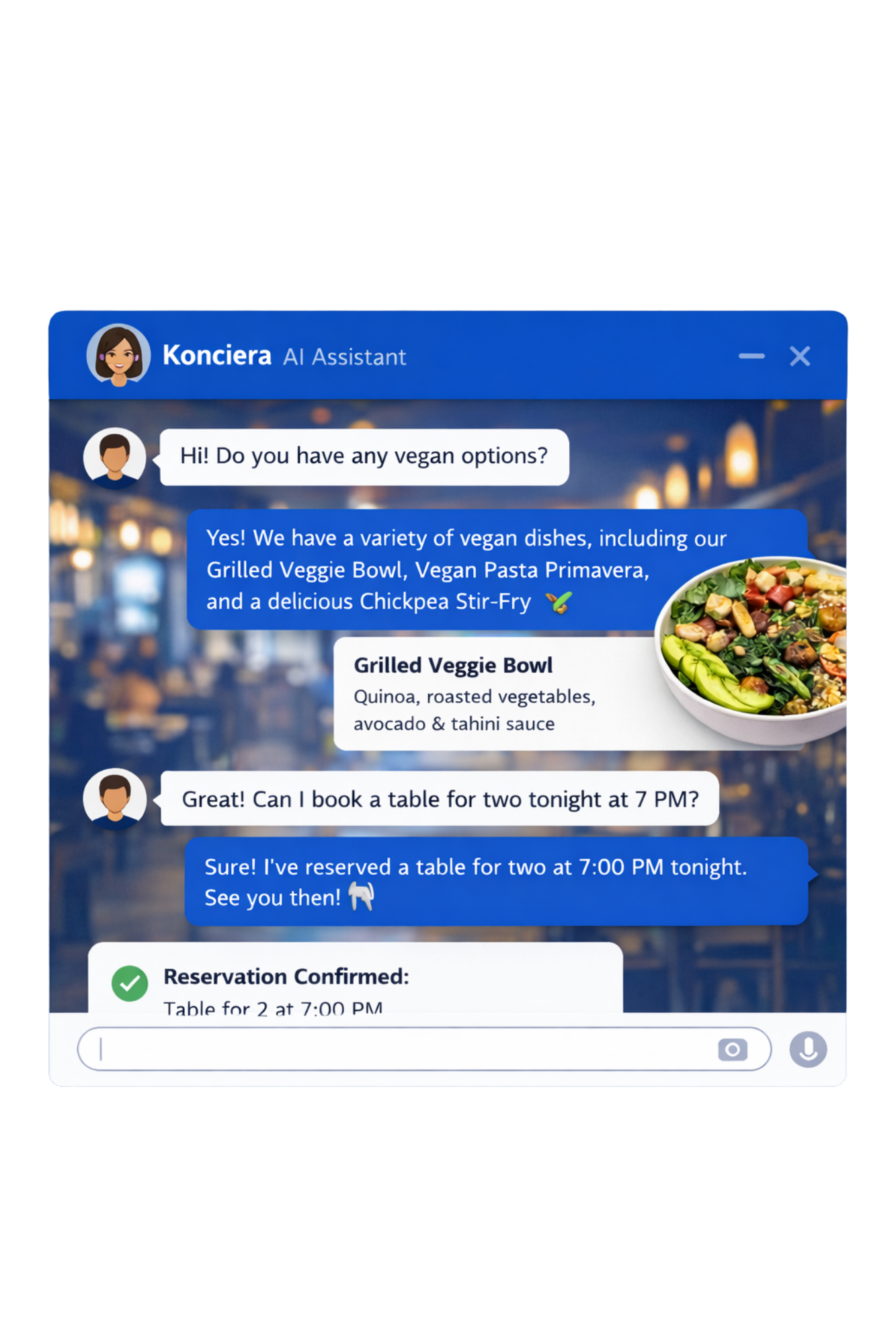 It doesn’t just chat—it completes workflows. Konciera can check availability, confirm reservations/appointments, answer policy and menu/service questions, collect required details, and hand off complex cases to your team with full context.